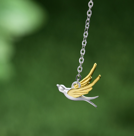 Spring Whisper Swallow & Willow Sterling Necklace,Sterling Silver 18K Gold Plated
